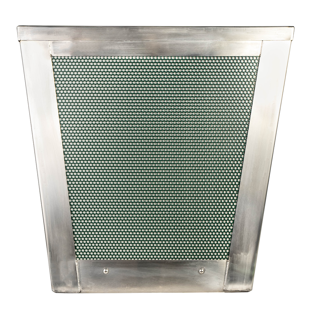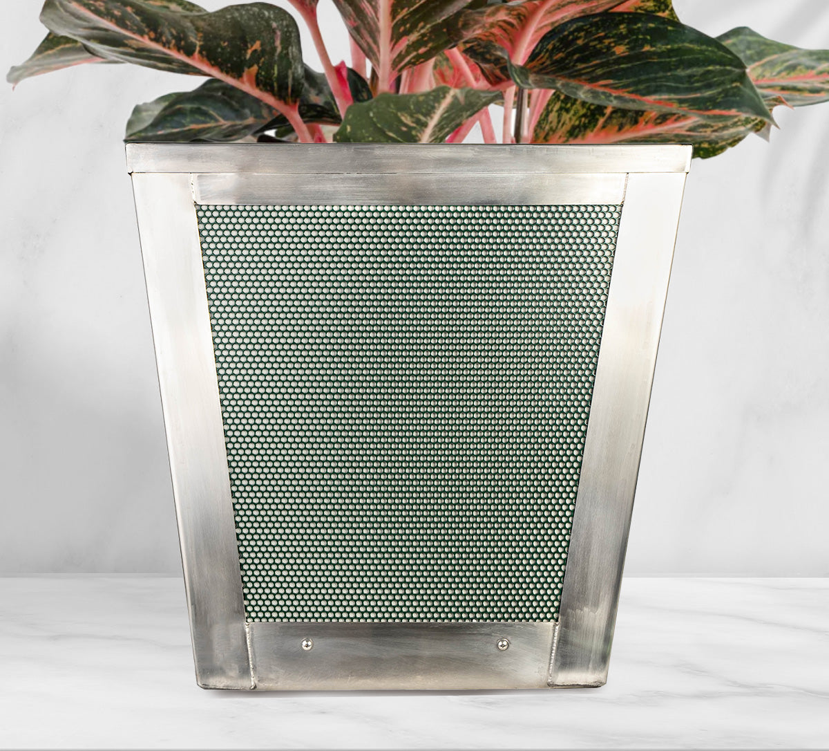 Honeycomb Metal Facing: This planter features a powder-coated perforated metal facing, creating a green appearance and honeycomb design that is sleek and smooth. This intricate detailing not only enhances airflow but also casts captivating shadows, blending function with artistry for a truly unique aesthetic experience.
